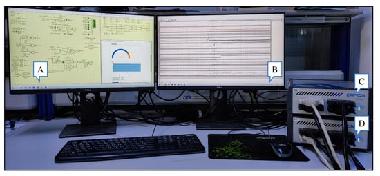 Real-time hardware-in-the-loop test-bench. A: PLECS user interface; B: signal monitor; C: real-time controller; D: plant emulator.