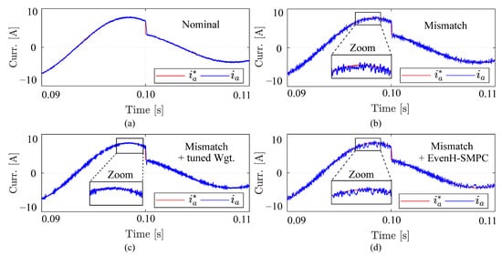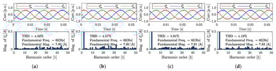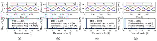 Figure 12 shows the overall control performance with the actual inductance set to 1.5 versus in the controller. The same transients described earlier for the case without parameter mismatch were applied. Figure 13 and Figure 14 show the machine-side and grid-side current THD in steady-state. All data are summarised in Table 4. As in the previous case, the performance of the DC-link voltage and active power tracking for the four schemes is identical in terms of the rapid response and low levels of ripples. Although even-handed sequential MPC has the highest voltage overshoot after the reference voltage step change, it produces the best overall performance for reactive power tracking. Meanwhile, the tracking accuracy of classical MPC is the worst in the case of parametric mismatch.