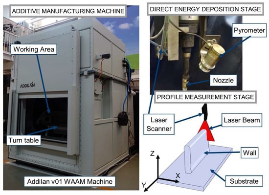 The Addilan WAAM machine (Durango, Spain) used to manufacture two walls was equipped with a tilt table (+2-axis) and a closed chamber with an inert atmosphere, making it suitable for working with reactive materials, such as titanium or aluminium. The machine utilized a GMAW process but also allowed for other processes, such as GTAW or PAW.
