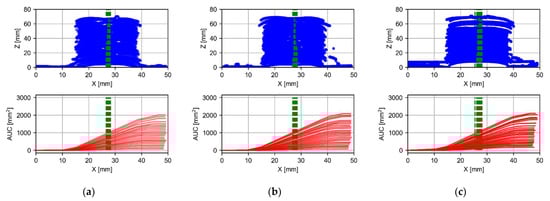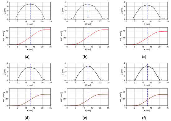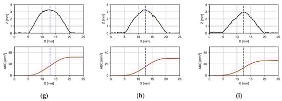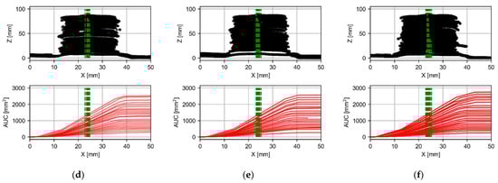 In Figure 7a–c, the pair bead profile and AUC are shown for the oscillating strategy at the first, fourth and seventh profiles, respectively. It can be observed that the beads have a relatively constant width along the deposition path. The profiles at the initial layers show more uncertainty due to the presence of spatter. In Figure 7d–f, the pair bead profile and AUC are shown for the overlapping strategy at the first, fourth and seventh profiles, respectively. The beads have a more irregular shape, with some sections wider than others.