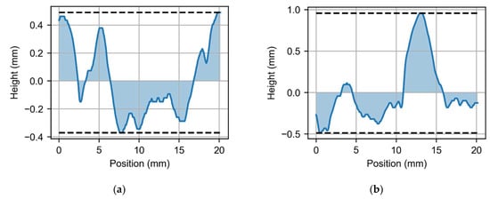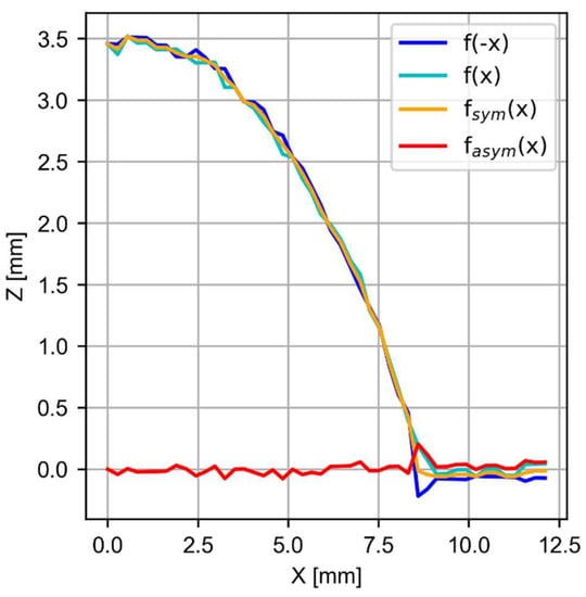 This paper describes an approach for analyzing the symmetry of layer profiles. To illustrate, the first profile in Figure 4a is taken. The approach is like that used by Veiga et al. [], which was applied to macroimages of the bead. The height of the bead (z) is written as function of the position x as z = f(x). f(0) is the geometric center of the bead where the area on the left and on the right are equivalent. The function z = f(x) gives the profile to the right of the central line, and z = f(−x) gives the profile to the left. The layer profile is defined as symmetrical when f(x) = f(−x). To quantify this symmetry, symmetric and antisymmetric functions (1) are defined through the x-axis as: