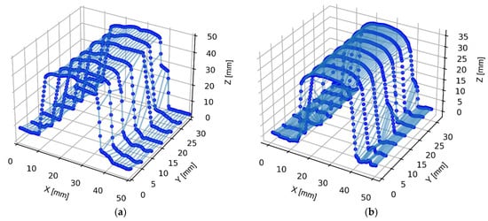 In this section, the results obtained in the fabrication of the multibead wall, either using a continuous oscillatory trajectory or a discrete bead overlapped trajectory, are shown and discussed. Figure 6 shows a three-dimensional reconstruction of layer 22 in a wall manufactured by two different welding strategies: overlapping (Figure 6a) and oscillating (Figure 6b). The wall is divided into layers, and layer 22 is shown in detail in the figure. In both (Figure 6a) and (Figure 6b), the layer appears to have a similar overall shape and structure. However, there are some differences in the distribution of material in the layer between the two strategies. In (Figure 6a), where the overlapping strategy was used, there appear to be more distinct regions of material deposition with three round shapes related to the three beads, showing higher peaks and deeper valleys. In contrast, in (Figure 6b), where the oscillating strategy was used, the regions of material deposition appear to be more spread out and less distinct, with smoother transitions between them.