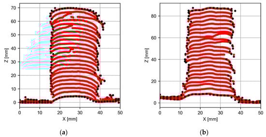 Point cloud recorded in the intermediate profile in all layers and calculation of the envelope (black dots) for the different strategies: (a) oscillating and (b) overlapping.