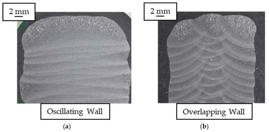 Figure 9 shows the macroscopic image with a comparison of the two walls manufactured using the oscillating and overlapping strategies. The geometric differences between the two strategies that were observed in the three-dimensional reconstruction (Figure 6) and bead profile analysis (Figure 8) may also be visible in the macroscopic image. The figure shows the characteristic peaks of the three discrete passes characteristic of the overlapping trajectory and a more fluid arrangement of the wall in the oscillatory trajectory.
