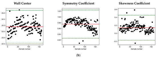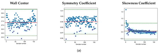 Descriptive parameters of wall symmetry, wall center, symmetry coefficient and skewness coefficient in (a) oscillatory (blue dots) and (b) overlapping strategies (black dots).