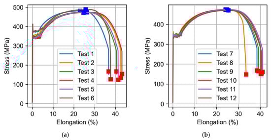 The walls manufactured using GMAW based on WAAM using both strategies were analyzed. Mechanical tests were carried out to obtain the stress–strain characteristics. For the mechanical characterization of both walls, six tensile specimens were extracted in the vertical direction and six tensile specimens in the horizontal direction. Furthermore, samples from each wall were utilized to analyze the surface quality based on the macrography analysis. Therefore, the selection of specimens at different orientations on the wall was performed. The dimensions of the tensile specimens followed standard ISO 6892-1, with a narrow diameter of 4 mm and a length of 22 mm, with threads at the ends of M-6. The machine where the uniaxial tensile tests were performed at room temperature was the Instron 5585H with a maximum load of 100 kN and equipped with a contact extensometer (Instron EX2620-602). Figure 11 displays the stress–strain curves and the corresponding calculations of ultimate tensile strength (UTS), yield strength (YS) and elongation percentage (Elong.) for each test specimen. The figure is divided into four subplots: overlapped horizontal direction (Figure 11a), overlapped vertical direction (Figure 11b), oscillating horizontal direction (Figure 11c) and oscillating vertical direction (Figure 11d). In each subplot, the stress–strain curve is depicted, showing the relationship between applied stress and resulting strain for the respective test specimen. Additionally, the UTS, YS and elongation values were calculated and are presented for each specimen.