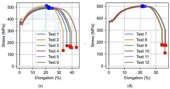 The stress–strain curve and ultimate tensile strength (UTS) (blue square), yield strength (YS) and elongation percentage (Elong.) (red square) calculation of each test specimen in (a) overlapped horizontal direction, (b) overlapped vertical direction, (c) oscillating horizontal direction and (d) oscillating vertical direction.