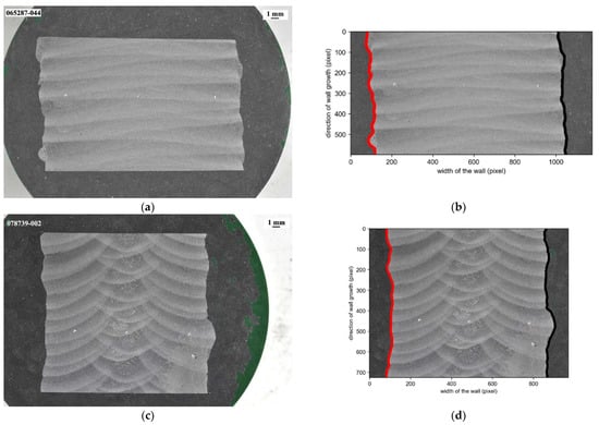 Macroimages of the central part of the manufactured wall by means of (a) macro of the oscillating wall, (b) determination of the limits of the wall surface, (c) macro of the overlapping wall and (d) determination of the sides of the wall.