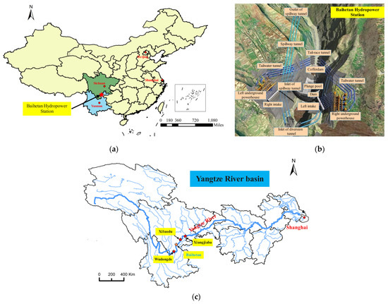 Location and components of the Baihetan hydropower station. (a) Location of the station; (b) Layout of the station; (c) The Yangtze River Basin and surrounding hydropower stations.