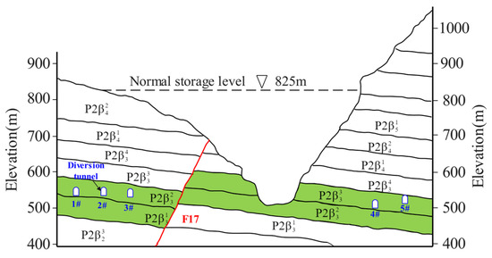 The terrain on both sides of the hydropower station is mainly composed of steeply inclined slopes. According to the geological survey reports, the rock strata at the dam site belong to the Permian Emeishan Formation () basalt. Columnar joints are mainly developed in several layers, including , , , and . The strike direction of the rock strata is N30°~E50°, as shown in Figure 2 [30]. The columnar basalts are densely developed in and , where the integrity of the columnar basalts is poor, and the rock quality designation (RQD) value is generally low, showing typical discontinuity and anisotropy, which has a significant adverse effect on the stability of the dam foundation, slopes, and underground caverns of the hydropower station.