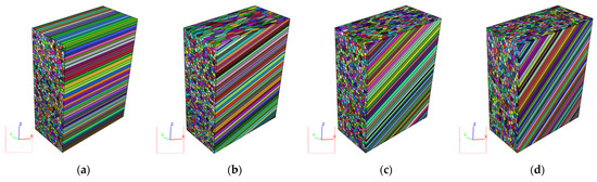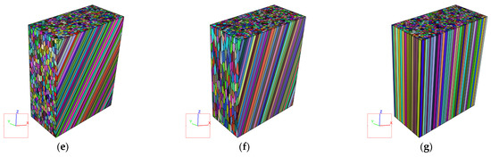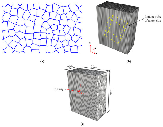 Firstly, a single-random movement Voronoi diagram of uniform seed points [32] was used to generate cross-sections that conform to the average prism diameter and the irregular factor (defined by the variation coefficient of the cross-sectional polygon area) using MATLAB [35], as shown in Figure 4a. Then, the two-dimensional cross-section was stretched into a solid using the graphical software Rhino, and the solid was cut according to a cube with the target geometric size, dip angle, and strike angle, as shown in Figure 4b. Finally, a geological geometric model of CJRM that better simulates irregular CJRM rock masses using geological statistical parameters was generated, as shown in Figure 4c.