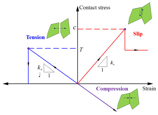 3DEC is a computational analysis program based on the discrete element theory, which describes the mechanical behavior of discrete media. The program divides rock joints and fractures into many discontinuous rock blocks, treating each block as a continuum. This is in line with the CJRM, where the intact rock mass is divided into cylindrical columns and intervening joints, forming a binary medium. Therefore, 3DEC is widely used in CJRM numerical simulation analysis [36]. In the columnar prism-intervening joint binary medium, the intact columns are modeled as deformable bodies and assigned to the Mohr–Coulomb constitutive model. The Coulomb slip joint constitutive model based upon elastic stiffness, frictional, cohesive and tensile strength properties, and dilation characteristics common to rock joints simulating displacement-weakening of the joint by loss of cohesive and tensile strength at the onset of shear or tensile failure can better reflect the sliding failure and tension of joint surfaces, providing a linear representation of joint stiffness and yield limit, which is very suitable for complex rock masses with multiple joint surfaces such as CJRM. Therefore, this joint model [37,38] was used in this paper, and the schematic diagram of the contact surface constitutive model is shown in Figure 5. According to the geological survey report and related numerical simulation studies of CJRM [25,39], the numerical model parameters are listed in Table 2 and Table 3.