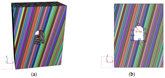 In the subsequent excavation process, the dimensions of the tunnel are shown in Figure 7a (taking a dip angle of 75° as an example) using a straight-wall circular arch shape with a width of 4 m, a height of 6 m, and a circular radius of 2 m. In order to monitor the deformation release response and stress change trend of the surrounding rock during tunnel excavation, eight monitoring points (P1 on the vault, P2 on the left spandrel, P3 on the right spandrel, P4 on the middle left wall, P5 on the middle right wall, P6 on the left wall foot, P7 on the right wall foot, and P8 on the floor) are set at the cross-section, which is vertical to the axis of the middle tunnel, as shown in Figure 7b. This is to facilitate the subsequent analysis of the stress–strain variation laws at different positions during the excavation and overloading process of tunnels in the CJRM with different dip angles.