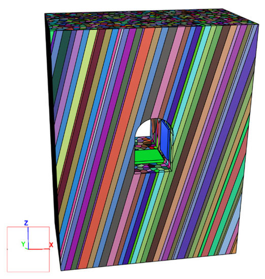 The irregular CJRM geometric models with different dip angles established in Section 3.2 were imported into the 3DEC software to generate geological numerical models of CJRM. The generated numerical models of basalt CJRM with different dip angles are shown in Figure 6.