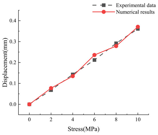 Model validation is a critical step in numerical simulation to check the rationality and reliability of the model. Comparing the results of on-site engineering tests with those of numerical simulations is the most effective method for model validation. To prove the accuracy of numerical simulations in this study, the in situ rigid bearing plate test conducted by Shi et al. [40] was used to verify the established numerical model. This test used a rigid bearing plate with a length of 50 cm, width of 50 cm, and thickness of 6 cm to establish the relationship between the pressure on the bottom surface of the bearing plate and the deformation of the rock mass below the bearing plate to obtain the deformation modulus of the rock mass. The pressure on the rigid bearing plate was increased from 0 MPa to 10 MPa at a regular interval of 2 MPa in the diversion tunnel, and the displacement was measured using four dial indicators. To simulate the test exactly after the tunnel excavation was completed, the numerical rigid bearing plate (Figure 8) was generated with the same pressure following the same test scheme, and the displacement of the numerical rigid bearing plate was observed to calculate the deformation modulus of the numerical model.