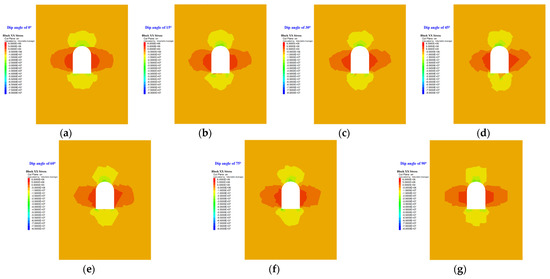 XX-stress distribution contour map of excavated geological numerical models. (a) Dip angle of 0°; (b) Dip angle of 15°; (c) Dip angle of 30°; (d) Dip angle of 45°; (e) Dip angle of 60°; (f) Dip angle of 75°; (g) Dip angle of 90°.