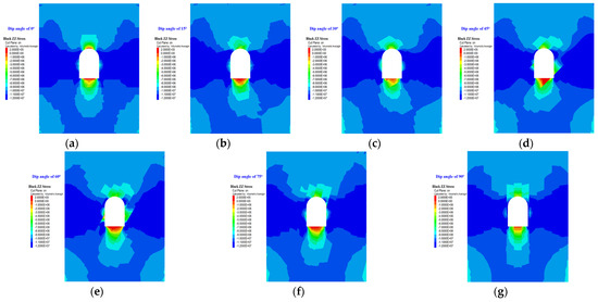 ZZ-stress distribution contour map of excavated geological numerical models. (a) Dip angle of 0°; (b) Dip angle of 15°; (c) Dip angle of 30°; (d) Dip angle of 45°; (e) Dip angle of 60°; (f) Dip angle of 75°; (g) Dip angle of 90°.