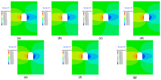 X-displace distribution contour map of excavated geological numerical models. (a) Dip angle of 0°; (b) Dip angle of 15°; (c) Dip angle of 30°; (d) Dip angle of 45°; (e) Dip angle of 60°; (f) Dip angle of 75°; (g) Dip angle of 90°.