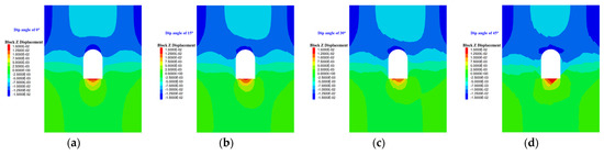Figure 12 and Figure 13 are the displacement distribution in the X direction and Y direction of excavated geological numerical models with dip angles, respectively. In order to facilitate the comparison of displacement distribution contour maps of different dip angles, the range and interval were also set to be the same. Similar to the features of stress distribution contour maps, the displacement distribution exhibits a strong non-symmetrical pattern with varying dip angles, with only two special angles (0° and 90°) presenting a symmetrical distribution along the centerline of the tunnel, reflecting the anisotropic characteristics of the strength and deformation of the CJRM.