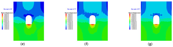 Z-displace distribution contour map of excavated geological numerical models. (a) Dip angle of 0°; (b) Dip angle of 15°; (c) Dip angle of 30°; (d) Dip angle of 45°; (e) Dip angle of 60°; (f) Dip angle of 75°; (g) Dip angle of 90°.