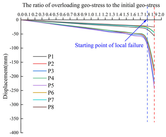 For CJRM engineering projects, currently, there is no unified safety factor, especially with regard to the different dip angles. The overloading assessment method of the safety factor provides a good approach and was used as the safety factor of CJRM in this paper [44,45]. Taking the overloading simulation of the CJRM geological numerical model with a dip angle of 45° after excavation, for example, the displacement curves of each monitoring point during the numerical overloading test are shown in Figure 15. When the ratio of geo-stress to the initial geo-stress is between 1.0 and 1.8, the displacement of each measuring point increases steadily without obvious displacement surges. This indicates that the overloading geo-stress is still within the self-supporting capacity range of the CJRM with a dip angle of 45°. However, when the ratio of geo-stress to the initial geo-stress reaches 1.9, there is a significant increase in displacement in the monitoring points of the left and right walls, as well as the right and left spandrels, indicating that local damage has occurred in these areas. Therefore, the overloading safety factor of the CJRM with a dip angle of 45° is determined to be 1.8. Using the same calculation method, the safety factors for the remaining dip angles were computed; the safety factors for each dip angle are shown in Table 6.