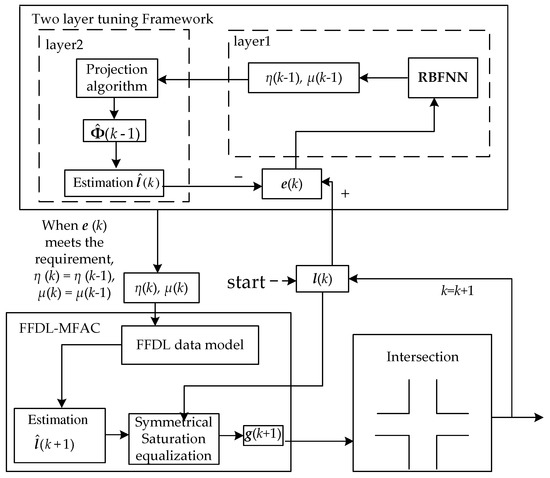 - A two-layer parameters tuning framework was designed for the MFAC controller, aiming to deal with the fast-changing demand. In the first layer, radial basis function neural network (RBFNN) was used to just two key parameters in the second layer (i.e., η(k) and μ(k)) based on the error function. Then, the two adjusted parameters drove the projection algorithm to estimate pseudo partitioned Jacobian and give a prediction of queuing length.