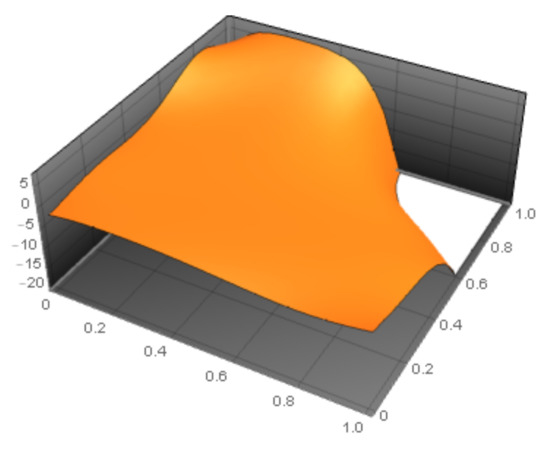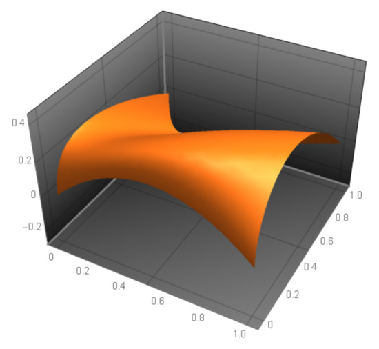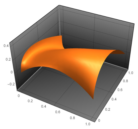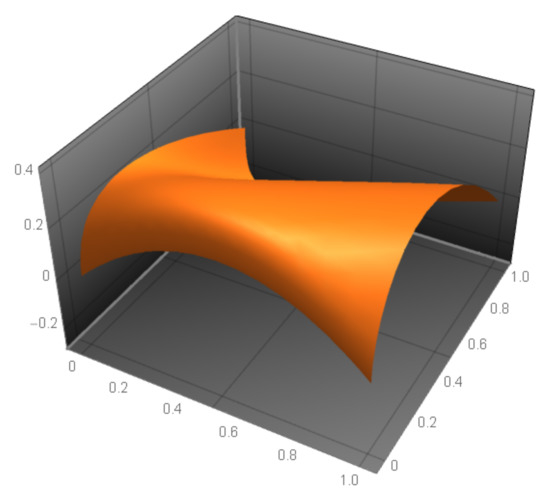 The mean curvature (71) for a locally parameterized minimal surface should identically be zero, or identically the numerator (Equation (72)) of the mean curvature (71) is zero. The fundamental coefficients can be found in Appendix A (Equations (A1)–(A6)), with in Equation (A7). Additionally, the numerator of the mean curvature of the BBCP, denoted by , is provided in Appendix A (Equation (A8)). The numerator of the mean curvature of the BBCP is shown in Figure 4.