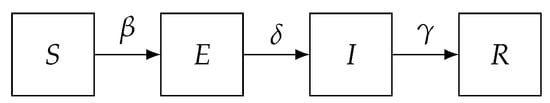 For the model ( and can be done similarly), if both and are exponentially distributed (with rates and , say), the model is called a Markovian SEIR model (see Figure 1). A special case of this SEIR model is one in which the exposed (latent) period is not random, as in [,,]. In this study, a fixed latent period of length l is assumed. The epidemic then develops based on the following transition probabilities in a small interval ,