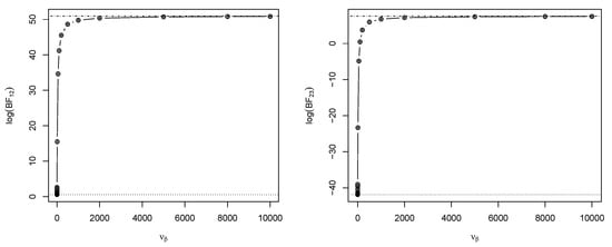 Under each prior assumption, namely and , the true values of the logarithm of Bayes factors were calculated using (10) and (14). The estimated values of the logarithm of Bayes factors, under different prior distributions, were computed as follows. Initially, we simulated K samples from the prior for each parameter and evaluated the marginal likelihoods based on these prior samples using (20)–(22). Then, the logarithm of Bayes factors was estimated using the following equations.
