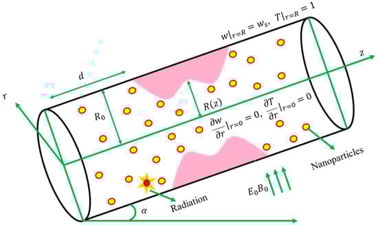 This study focuses on a mathematical model that analyzes the flow of a time-dependent, two-dimensional blood-based hybrid nanofluid. The model specifically examines the flow of silver–titanium dioxide nanoparticles in a slanted artery with W-shape symmetric stenosis, as shown in Figure 1. The study uses a nanoparticle volume fraction model to analyze the biomagnetic blood flow. It is important to note that the blood fluid being analyzed contains both silver and titanium dioxide nanoparticles. The direction of blood flow is opposite to the direction of the strongest Lorentz force. The arterial radial and axial coordinates are represented by and in this modeling, which uses the two-dimensional cylindrical coordinate system [33,34,35,36,37]. The present study focuses on the analysis of an electrically conducting incompressible unsteady blood hybrid nanofluid. A modified Tiwari–Das nanoscale model is employed, allowing for the determination of unique properties of the actual nanoparticles, such as viscosity, thermal conductivity, specific heat capacity, and density. The flow equation takes into account the influence of body force. Since the induced magnetic field strength is relatively small compared to the external magnetic field (resulting in a small magnetic Reynolds number), it is neglected in the analysis. Additionally, Hall current, ion slip, and Maxwell displacement currents are also disregarded. Viscous dissipation and joule heating, however, are considered in the energy equation. Given the unsteady nature of blood flow, pulsatile pressure gradient and wall slip effects in streaming blood are taken into consideration as well.