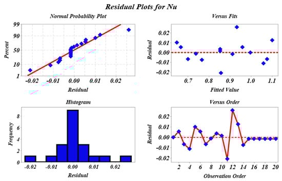 The validation of the model’s accuracy is achieved by employing residual plots for the responses Nu, as illustrated in Figure 2. The normal probability plot exhibits a linear trend where all data points are aligned. The presented histogram illustrates that the data exhibit a degree of symmetry and minimal skewness. This illustrates that the acquired data are representative. The residual versus fitted plot indicates that the maximum residual for Nu is approximately 0.0623. Furthermore, the value of S is 0.0132495, the coefficient of determination (R2) is 99.45%, the adjusted R2 is 99.95%, and the predicted R2 (R2 (Pred)) is 95.52%, indicating a high degree of correlation and a well-fitted model. The aforementioned particulars provide evidence for the assertion that the chosen model is dependable and appropriately fitting.