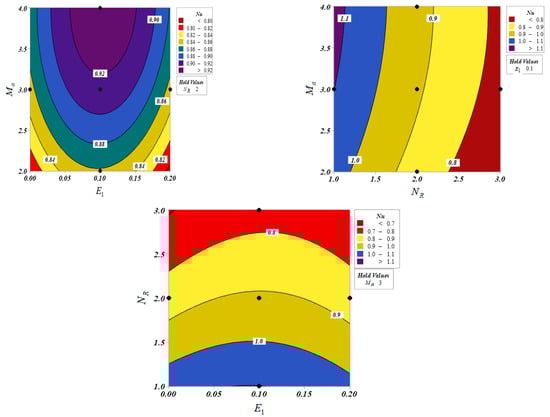 Figure 3 discovers the silhouette plots projected to explore the influences of operative factors (, , and ) on the responses Nu. Figure 3a–c depict the effect of Figure 3a interaction with with hold , Figure 3b interaction with with hold , and Figure 3c interaction with with hold on Nu. It is notable that at all levels, the interaction of two factors is carried out, and the medium value of the third parameter is fixed as a hold value. The heat transfer rate is increased by the lower and values. In the cases of and , the similar nature is shown. As and are increased, the rate of heat transfer increases. Figure 3a reveals the influence of and on the heat transfer rate. It is observed that lower levels of (2–3) and all levels of result in a reduction in the heat transfer rate. However, increasing the magnetic field from 3.5 to 5 leads to a significant enhancement in the heat transfer rate for all levels of . Moreover, analysis of Figure 3b,c reveals that varying the levels of consistently leads to a significant decrease in the heat transfer rate. However, an increase in within the range of 3–4 and within the range of 0.05–0.1 effectively enhances the heat transfer rate, particularly when the level of is relatively low. The comprehensive findings from these figures indicate a clear correlation between the heat transfer rate of the hybrid nanofluid and the levels of thermal radiation and magnetic field. Specifically, a lower level of thermal radiation coupled with a higher level of magnetic field exhibits a pronounced enhancement in the heat transfer rate.