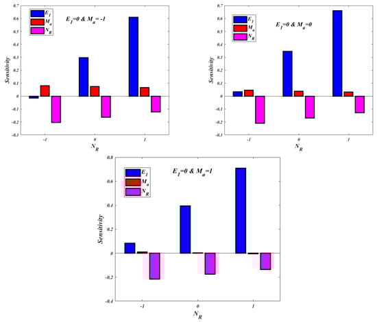 This section employs independent parameters to ascertain the level of sensitivity of the heat transfer rate. The utilization of sensitivity functions involves the evaluation of changes in responses (Nu) in relation to the variables, namely , , and , which are derived from the regression equation. These sensitivity functions are employed to determine any progression or regression in the responses.
