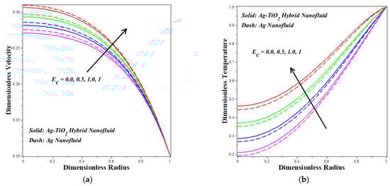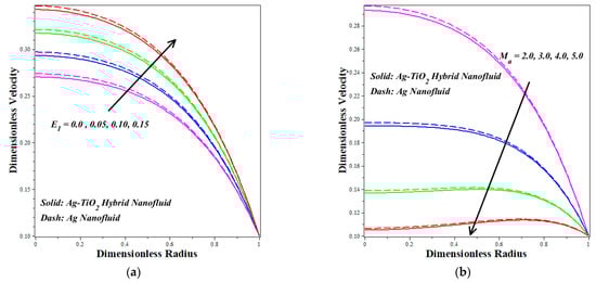 The velocity and temperature profiles that are dimensionless for different values of the electric field parameter are illustrated in Figure 5a, showing that enhancing the performance leads to an elevation in the velocity profile for both Ag–TiO2 hybrid nanofluid and Ag nanofluid. Increasing the electric field parameter leads to a noticeable increase in flow velocity. This can be attributed to the accelerating force induced by the electric field, which acts in the direction of the applied electric field. Consequently, the momentum boundary layer thickness expands, resulting in the acceleration of the fluid. The figure reveals that as the value of increases from 0 to 0.15, the blood velocity shows a significant rise of 26.83% in the hybrid nanofluid case, similar to a 26.53% increase observed in the silver nanofluid case. Figure 5b demonstrates the impact of the Hartmann number on the velocity profile of Ag–TiO2 hybrid nanofluids in the blood. It is observed that an increase in (indicative of a stronger Lorentzian drag force) significantly hinders the blood flow in the core region, which is located near the artery’s centerline. When = 0, corresponding to a zero radial magnetic field, the blood behaves as a non-conducting fluid. When = 2, both the magnetic and viscous hydrodynamic forces are equally influential. The presence of a stronger magnetic field effectively regulates and attenuates the blood flow, offering improved control in biomedical procedures through nonintrusive means, such as the application of an external magnetic field. This parameter also plays a crucial role in adjusting the fluid velocity. According to the figure, it is evident that an increase in the values of from 2 to 5 leads to a significant reduction in blood velocity. In particular, the hybrid nanofluid case demonstrates a substantial decline of 64.19.83%, and a similar decrease of 64.14% is observed in the silver nanofluid case.