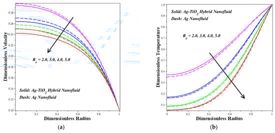 The visualization of the impact of Reynolds number (Re) on blood flow velocity and temperature profile is presented in Figure 6a,b. It is worth mentioning that the analysis pertains to extremely low Reynolds numbers, indicating laminar flow; consequently, the system is governed by viscous forces. The results of the computations indicate that an increase in the Reynolds number from 2 to 5 has resulted in a noteworthy decrease in velocity. Similarly, with an increase in Reynolds number, there is a corresponding decrease in temperature. Despite the fact that the Reynolds number (based on the vessel radius) causes an increase in inertial force, the primary impact is the deceleration of flow due to stenotic obstruction and nanoparticles. This results in a considerable impediment to the streaming blood. At higher Reynolds numbers, temperature suppression occurs and the profiles exhibit a decreasing gradient. The profiles become attached to the zero line, and subsequent temperature growth from the wall occurs over longer radial distances. It is observed that varying the Reynolds number from 2 to 5 results in a decrease in fluid velocity and temperature. Specifically, for hybrid nanofluids, there is a reduction of 15.72% in fluid velocity and 85.15% in temperature, whereas for silver nanofluids, the corresponding reductions are 17.51% and 85.82%, respectively.