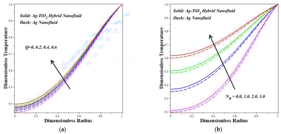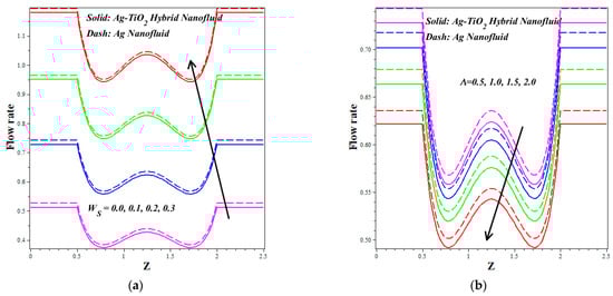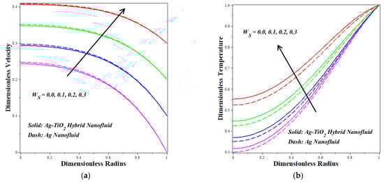 The velocity and temperature profiles’ development is illustrated in Figure 7a,b concerning the variation in Ag–TiO2 hybrid nanofluids and Ag nanofluids and wall slip velocity. The study indicates that an elevation in the wall slip parameter results in a corresponding augmentation of the blood flow velocity in the vicinity of the artery’s centerline. The velocity profile of a blood nanofluid experiences an increase in the wall slip parameter, which can be attributed to a multitude of factors. These factors include heightened shear stress and turbulence in the vicinity of the boundary at elevated velocities, as well as the intricate interdependence between the fluid properties and boundary conditions. Figure 7b illustrates that as the slip parameter increases, there is a noticeable rise in acceleration temperature. The imposition of the slip parameter at the inner surface of the arterial wall serves as a boundary condition. The slip velocity’s existence results in a momentum increase that aids the blood in the near-wall region and quickens blood flow. However, the impact diminishes as the radial distance from the arterial centerline increases. The variation of wall slip from 0 to 0.3 leads to an increase in both fluid velocity and temperature. In the case of hybrid nanofluids, the fluid velocity experiences a rise of 64.06%, whereas the temperature decreases by 84.34%. Similarly, for silver nanofluids, the corresponding enlargement is 65.41% in fluid velocity and 66.33% in temperature.