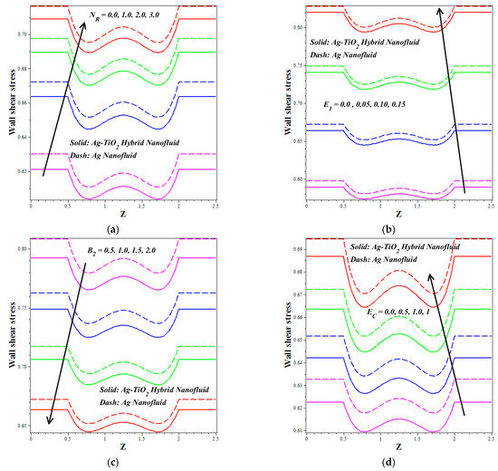 Figure 8a,b provide a graphic representation of how the Eckert number (Ec) affects the blood flow velocity and temperature profile. The research findings suggest that an increase in the Eckert number (Ec) leads to a proportional enhancement of the velocity of blood flow in the proximity of the centerline of the artery. The increase in the Eckert number (Ec) is responsible for the alteration of the velocity profile of a blood nanofluid, and this phenomenon can be attributed to various factors. Figure 8b illustrates the impact of Ec on the nondimensional temperature profile. The rise in the Ec value indicates a corresponding rise in the temperature distribution within the flow zone. This phenomenon is attributed to the accumulation of heat energy in the fluid due to frictional heating, leading to an increase in the temperature of the fluid (blood). When the Eckert number is varied from 0 to 1, both fluid velocity and temperature show a noticeable increase. The elevation in fluid velocity is 13.14% for hybrid nanofluids and 12.44% for silver nanofluids. Additionally, the temperature experiences a significant incline of 120.72% in the case of hybrid nanofluids, and a corresponding reduction of 130.53% is observed for silver nanofluids. The temperature profile is investigated by plotting Figure 9a,b to examine the impact of heat source parameter and thermal radiation features. The diagram depicted in Figure 9a demonstrates the correlation between the heat source parameter and the temperature profile. The figure indicates that the temperature profile rate is augmented by the settings. The temperature distribution of a blood nanofluid, subject to a heat source, is contingent on the distinct characteristics of both the fluid and the source of heat. The fluid’s behavior may be influenced by various factors, including the concentration and size distribution of the suspended particles, the thermal conductivity and heat capacity of the fluid, and the geometry and distribution of the heat. By varying Q from 0 to 0.6 and from 0 to 3, a noticeable increase in temperature is observed. Specifically, for hybrid nanofluids, the temperature experiences a significant elevation of 8.17% for Q and 194.47% for . Similarly, in the case of silver nanofluids, the corresponding enhancements in temperature are 9.09% for A1 and 205.42% for source. The data presented in Figure 9b indicate that enhancing thermal radiation has a positive correlation with the temperature profile. The temperature profile exhibits an upward trend as the values of Nr increase. This phenomenon occurs because of the Inverse relationship between the radiation parameter and thermal conductivity, indicating that the system dissipates more heat through radiation. Radiation acts as a source of heat within the bloodstream, and higher radiation levels result in an elevation of temperature. When nanoparticles, such as gold and alumina, interact with light of the appropriate wavelength, the free electrons within them undergo oscillations. The heat generated by these oscillations spreads to the surrounding environment, leading to the destruction of malignant cells. This discovery holds significant potential in the field of thermal therapy, offering numerous applications for targeted cancer treatment. Figure 10 shows the wall shear stress profiles for a variety of factors, including the thermal radiation , electric field , amplitude of body acceleration , and Eckert number . Figure 10a illustrates the impact of on wall shear stress. As the values increase, there is an inclination in the wall shear stress profiles. The phenomenon of thermal-radiation-induced temperature rise is limited to a specific area, and it may result in an opposing outcome, whereby a localized temperature increase can trigger a corresponding rise in the viscosity of the blood in that particular region. The augmentation in viscosity may lead to a rise in the wall shear stress due to the amplified frictional drag on the surface. Figure 10b demonstrates the influence of the electric field on the profiles of wall shear stress. As the values increase, there is an inclination in the wall shear stress profiles. For different values of the dimensionless amplitude of the body acceleration, Figure 10c shows the dimensionless steady state period at which the minimum blood flow is attained in the wall shear stress profiles. The viscous drag force that a body experiences when moving in a fluid is what causes the amplitude of body acceleration to decrease as wall shear stress increases. Figure 10d shows that the wall shear stress enlargements as the Eckert number increases. The variations in , , and have a promoting effect on wall shear stress, leading to values of 41.02%, 14.33%, and 10.05% for the hybrid nanofluid case and 38.45%, 14.29%, and 9.74% for the unitary nanofluid case. On the other hand, the effect of causes a reduction in wall shear stress, with values of 18.15% observed for the hybrid nanofluid and 15.47% for the unitary nanofluid. From these figures, it is evident that the unitary nanoparticles yield a significantly higher wall shear stress compared to the hybrid nanoparticles. This can be attributed to the dominant fluid velocity behavior exhibited by the silver nanoparticles in the W-shaped stenotic artery.