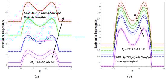 The effects of different wall slip velocity and Womersley numbers on the volumetric flow rate are shown in Figure 11a,b. The Womersley numbers on the volumetric flow rate in the situations of Ag–TiO2 hybrid nanofluids and Ag nanofluids show the opposite nature, and this quantity likewise greatly rises for the larger values of the wall slip velocity. The slip velocity at the wall lowers the effective fluid viscosity and causes a thinner boundary layer, which, in turn, causes the flow rate to drop for higher values of the wall slip velocities. In the hybrid nanofluid case, the variation of slip velocity leads to an increase in flow rate, with a value of 132.55. Similarly, in the unitary nanofluid case, the flow rate is boosted with a value of 124.10. Additionally, the effect of Womersley numbers results in a decrease of 15.92 for the hybrid nanofluid and 14.07 for the unitary nanofluid. The effects of different Hartmann numbers and Reynolds numbers on the resistance to flow are shown in Figure 12a,b. The diagram depicted in Figure 12a demonstrates the correlation between the Hartmann number and the resistance to flow. The figure indicates that the resistance to flow profile rate is augmented by the situations in both the Ag–TiO2 hybrid nanofluids and Ag nanofluids. Figure 12b also has the same nature for the higher values of the Reynolds number in the resistance to flow. The impacts of and on hybrid nanofluids leads to significant enhancements in resistance impedance, with values of 89.58% and 17.48%, respectively. In addition, for the unitary nanofluid, the enhancements are observed as 108.05% and 15.83%, respectively.