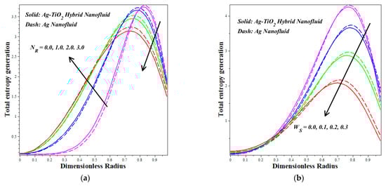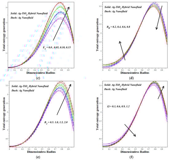 Figure 13a–f show that the total entropy production has been studied by looking at the thermal radiation , wall slip velocity , electric field , Brickman number , amplitude of body acceleration , and temperature difference through numerical integration. Figure 13a shows that increasing thermal radiation tend to enhance the generation of entropy. The phenomenon of entropy generation is observed to be directly proportional to the radiation parameter, as the latter leads to an augmented radiative heat transfer between the system and its surroundings. This, in turn, causes a significant rise in the temperature differential, thereby resulting in a greater degree of irreversibility. The inverse relationship between the entropy generation profile and wall slip velocity is depicted in Figure 13b. The increase in wall slip velocity results in a decrease in entropy generation due to the reduction in frictional forces and subsequent decrease in the rate of irreversibility within the boundary layer. The tendency for increasing entropy production to occur when the electric field is raised is seen in Figure 13c. The phenomenon of entropy generation exhibits a positive correlation with elevated levels of electric field due to the generation of joule heating by the electric field. This, in turn, leads to an increase in temperature gradient and, consequently, a higher rate of irreversibility. It is observed that higher values of the Brickman number to the entropy generation is initially increasing and reducing, which is shown in Figure 13d. Figure 13e shows that increasing amplitude of body acceleration tends to enhance the generation of entropy. The amplitude of body acceleration has a direct impact on entropy generation, as higher values of acceleration result in the production of additional mechanical work. This, in turn, leads to a greater rate of irreversibility and a subsequent increase in the generation of entropy. It is observed that higher values of the temperature difference to the entropy generation is initially decreasing and rising, which is shown in Figure 13f. Increasing the values of in the system leads to a reduction in joule heating irreversibility, hybrid nanofluid friction irreversibility, and heat transfer irreversibility. As a result, the total entropy generation decreases near the wall. However, the dominant influence of resistive force and electric field on the behavior of causes an increase in total entropy production near the top wall. The figures demonstrate a noticeable disparity in total entropy generation between the top and bottom walls. Specifically, the hybrid nanofluid case shows an increase of approximately 3019.67% at the top wall, and the unitary nanofluid case exhibits an increase of approximately 3242.86%.