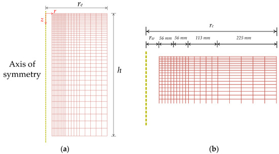 Several studies on finite element meshing of consolidation by vertical drain have been conducted by various scholars, such as Xie, Chen, and Deng [19,20,21,22]. From their findings, two essential conclusions can be drawn. Firstly, the horizontal element size of the soil surrounding the vertical drain has a significant impact on the level of consolidation achieved—larger horizontal elements result in faster consolidation. Secondly, to obtain excess static pore pressure results with high accuracy, the mesh in the depth direction of the soil needs to be subdivided near the top surface. To balance the need for a realistic reflection of soil seepage and the calculation speed, the soil depth direction employs single-bias seeding, which creates 40 elements with a bias ratio of 20. The seeds are more densely distributed near the top and gradually become sparser towards the bottom. Furthermore, the radial direction is divided into four areas (as per Figure 2b). Each of the four areas is divided into five uniform elements—seeds near the vertical drain are dense, and the distance between them progressively increases further out. Structured meshing was adopted here, and the mesh type CAX4P (4-node axisymmetric quadrilateral, biquadratic displacement, and bilinear pore pressure) was selected. The resulting finite element mesh can be observed in Figure 2.