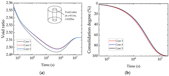 The horizontal gridding for Cases 1, 2, and 5 was the same, while the vertical gridding differed. Figure 3a displays the results of the void ratio at z = 0.1 m and r = 0.05 m for the foundation under the three cases. The results indicated that the vertical ground mesh spacing affected the void ratio in the shallow region.