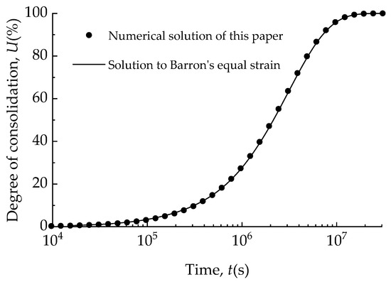 The curve of the consolidation degree over time, assuming equal strain, is displayed in Figure 4. The plot compares the results of using Barron’s solution of Equation (15) with the numerical solution of the model described in Section 3.2. As Figure 4 shows, our numerical simulations closely matched the theoretical values, providing strong evidence of the accuracy and usefulness of our model.