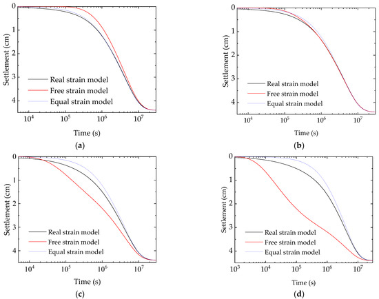 Figure 10 demonstrates that the void ratio of soil calculated by the free strain model was consistent with the real strain model’s soil at the bottom, while the equal strain assumption can only reflect the change of the void ratio of the soil at R = 1/2. Neither assumption can accurately predict the void ratio of the soil near the top of the vertical drain (Figure 10d). The change of the void ratio reflects the change of effective stress. Many researchers have discovered relationships between the permeability coefficient, compressibility coefficient, and effective stress change [24,25]. Therefore, considering these two parameters’ changes with the average effective stress, merely applying Barron’s assumptions would introduce numerous errors.
