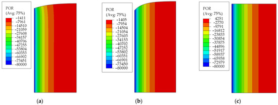 Vertical stress cloud on the deformed shape of three cases (t = 2.56 × 105 s, Unit: Pa): (a) real strain condition, (b) free strain assumption, and (c) equal strain assumption.
