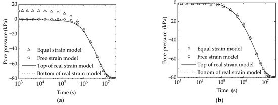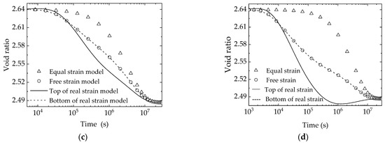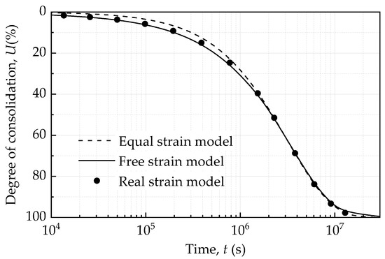 Under the assumption of free strain, the shear deformation does not influence the consolidation rate, the term with shear strain in Equation (5) is supposed to be equal to zero, and therefore we assume the shear modulus G is zero, and the relation between shear modulus, elastic modulus, and Poisson’s ratio, G = E/[2(1 + μ)], does not hold. Equation (5) can be simplified to: