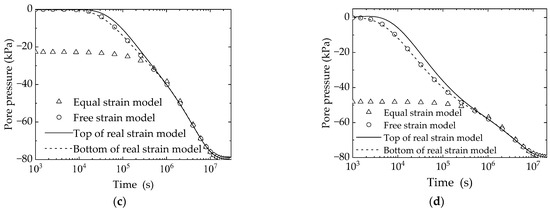 Under the real strain condition, the pore pressure of soil varied with different depths. In the early stage of consolidation, the pore pressure of the soil at the top of the inner side was higher than that at the bottom (as shown in Figure 9a), while the pore pressure of the soil at the top of the outer side was lower than that at the bottom (as shown in Figure 9c,d). As the consolidation progressed, the pore pressure at the top and bottom of the soil tended to become equal.