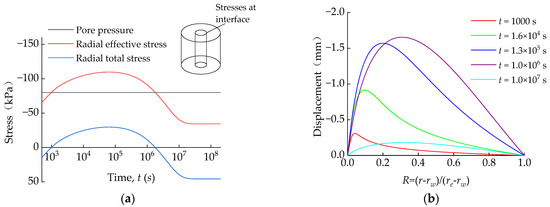During the consolidation process of the real strain model, the outer soil underwent radial shrinkage under vacuum pressure, and the contracted shell squeezed the inside, leading to an increase in the total stress of the soil near the vertical drain. As the soil near the vertical drain is close to the negative pressure boundary, the pore pressure quickly reached −80 kPa and remained constant. Therefore, the increase of the total stress did not lead to the increase of the pore pressure, but the increase of the effective stress. Figure 11 illustrates the curves of radial effective stress of the soil at the top of the vertical drain. It was observed from the graph that within 1.3 × 105 s, the radial displacement of the soil at 0 < R < 0.2 continued to increase, and the total horizontal stress of the soil at the top of the vertical drain also increased, while the pore pressure remained at −80 kPa, resulting in an increase in horizontal effective stress. Due to the Mandel–Cryer effect, the increase in effective stress during consolidation exceeded the increase caused by vacuum pressure, leading to a further reduction in the void ratio. Since there is a relationship between the permeability coefficient of soil and the void ratio, the Mandel–Cryer effect of vacuum preloading can significantly reduce the permeability coefficient of soil, which partially explains the silting phenomenon near the vertical drain during vacuum preloading. Both the equal strain assumption and the free strain assumption only study the dissipation process of pore water pressure in soil, without involving the coupling effect of soil deformation. Hence, the Mandel–Cryer effect did not occur in these assumptions.