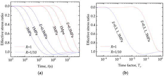 Influence of elastic modulus on the effective stress ratio: (a) the relationship between the effective stress ratio and time and (b) the relationship between the effective stress ratio and the time factor.