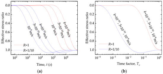 Influence of the permeability coefficient on the effective stress ratio: (a) the relationship between the effective stress ratio and time and (b) the relationship between the effective stress ratio and the time factor.