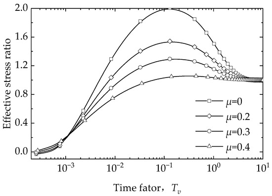 This section investigates the effect of Poisson’s ratio on the consolidation of soil during the vacuum preloading process by assigning different Poisson’s ratios to the soil, while keeping other parameters constant. The compression modulus of soil is affected by Poisson’s ratio. As observed in Figure 15, increasing Poisson’s ratio from 0 to 0.4 moved the curves of the consolidation degree to the left. This phenomenon occurs because an increase in Poisson’s ratio leads to a higher compressive modulus, and thus, a faster consolidation rate, while the elastic modulus of soil remains the same. On the other hand, Poisson’s ratio affects the Mandel–Cryer effect during consolidation. As depicted in Figure 16, under real strain conditions, a decrease in Poisson’s ratio resulted in a larger peak value of the effective stress ratio of the soil near the top of the vertical drain. This indicated that the soil in this region was denser during the consolidation process than it was upon completion of consolidation. The Mandel–Cryer effect increased with the decreasing Poisson’s ratio [27]. Hence, Poisson’s ratio exerted an influence on the effective stress ratio of soil during consolidation, significantly affecting the local consolidation degree. However, since the soil was linear elastic and had a constant permeability coefficient, the Mandel–Cryer effect would not affect the average consolidation degree. As shown in Figure 15, when the abscissa was changed to the time factor, the average consolidation curves of soil with different Poisson’s ratios completely coincided.